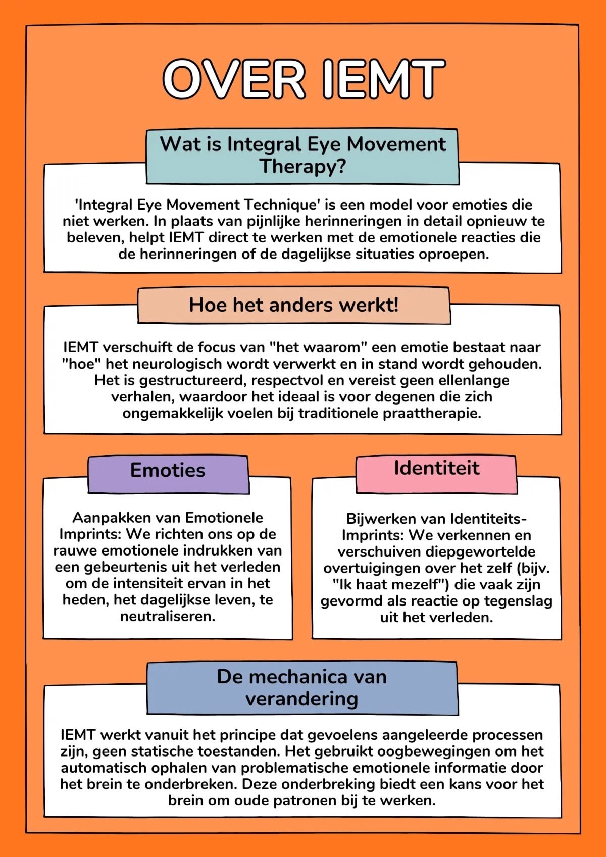 Wat is IEMT? 'Integrated Eye Movement Technique' is een model voor emoties en gevoelens die niet werken. In plaats van pijnlijke herinneringen in detail te (her)beleven, leer je met IEMT direct te werken met de emotionele reacties die de herinneringen of de dagelijkse situaties oproepen.